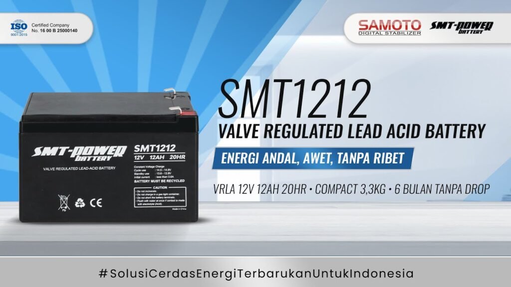SMT1212 dari Samoto Mega Teknologi adalah baterai VRLA 12V 12AH, andalan untuk kendaraan listrik kecil, UPS, dan sistem tenaga surya. Tahan lama, kapasitas besar, dan performa stabil. Self-discharge rendah dan cocok untuk penggunaan industri maupun pribadi. Garansi resmi 1 tahun. Stok ready, siap kirim ke seluruh Indonesia. Pelajari lebih lanjut tentang Baterai VRLA Kapasitas Sedang sebagai solusi optimal untuk kebutuhan energi menengah di sini.