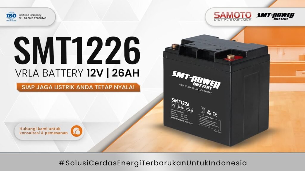 SMT1226 dari Samoto Mega Teknologi adalah baterai VRLA 12V 26AH, andalan untuk UPS industri, sistem tenaga surya, dan kendaraan listrik. Kapasitas besar, performa stabil, self-discharge rendah, dan desain tangguh memastikan suplai daya handal di kondisi ekstrem. Solusi ideal untuk kebutuhan profesional dan industri. Garansi 1 tahun. Pelajari lebih lanjut tentang Baterai VRLA Kapasitas Sedang sebagai solusi optimal untuk kebutuhan energi menengah di sini.